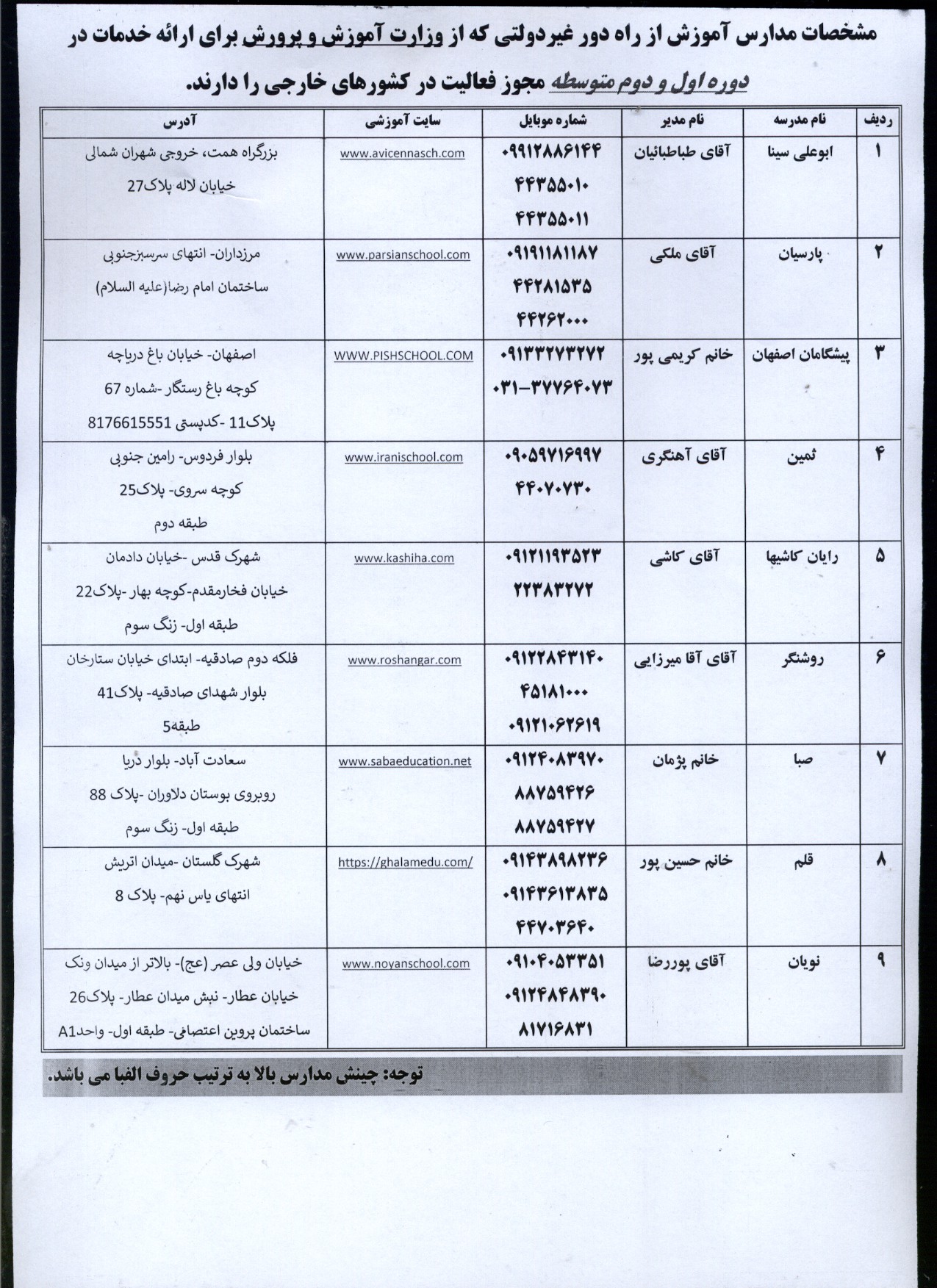 لیست اسامی مدارس آموزش از راه دور غیر دولتی خارج از کشور